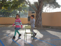 Ahir dilluns compartirem jocs al pati amb els alumnes de 5è. Hi havia 4 grups i els més grans acompanyaven als petits. Els alumnes anaven rotant pels diferents jocs, el de bitlles, cursa de globus, el maçot i el joc de les cadires. Us mostro fotos del joc de les cadires, que era el joc del que jo m'encarregava, ja ja.