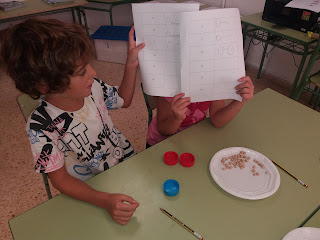 Divendres, comptàvem amb l'ajuda d'una altra mestra, na Teresa Pérez. Per això, vàrem poder fer una feina més xula. Com ja sabem, no és suficient treballar un contingut d'una sola manera. Per aquest motiu, vàrem fer diferents jocs amb les unitats/desenes i els grups varen anar canviant d'activitat.